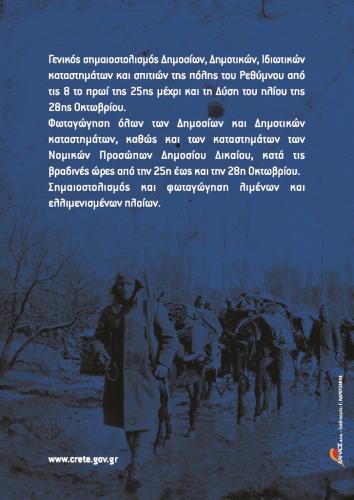 Γενικός σημαιοστολισμός δημοσίων, δημοτικών, ιδιωτικών καταστημάτων και σπιτιών της πόλης του Ρεθύμνου από τις 8 το πρωί της 25ης μέχρι και τη Δύση του ηλίου της 28ης Οκτωβρίου.