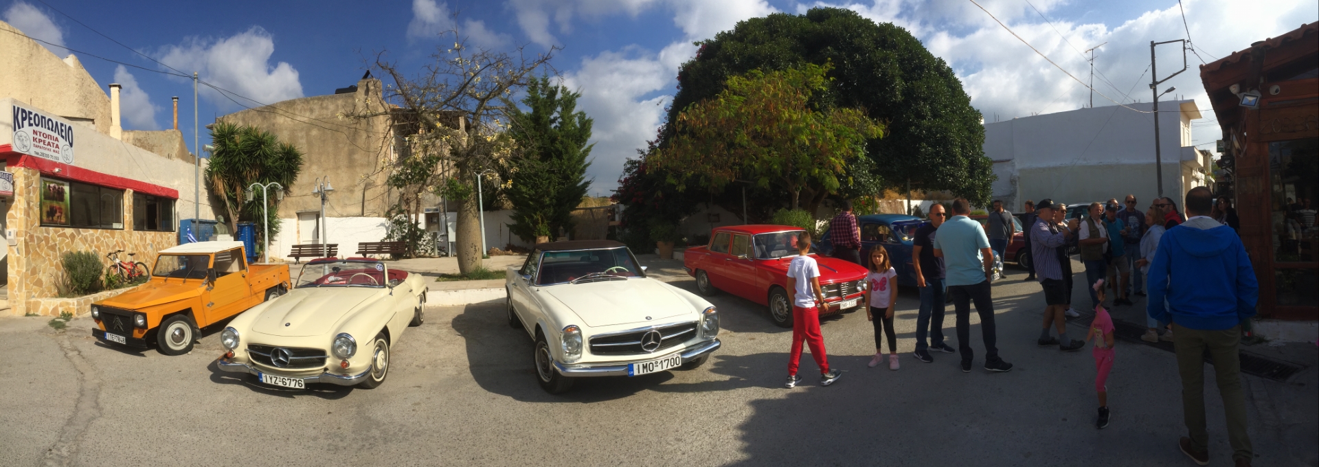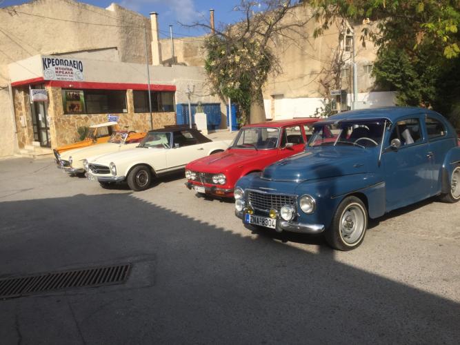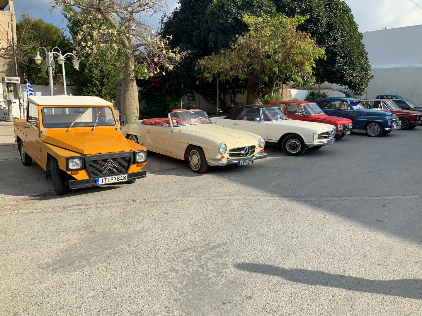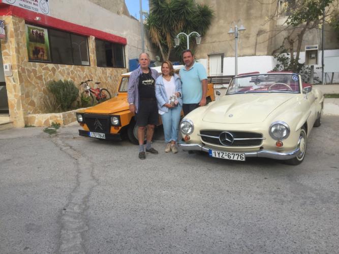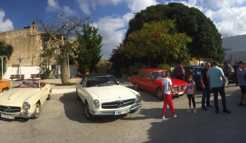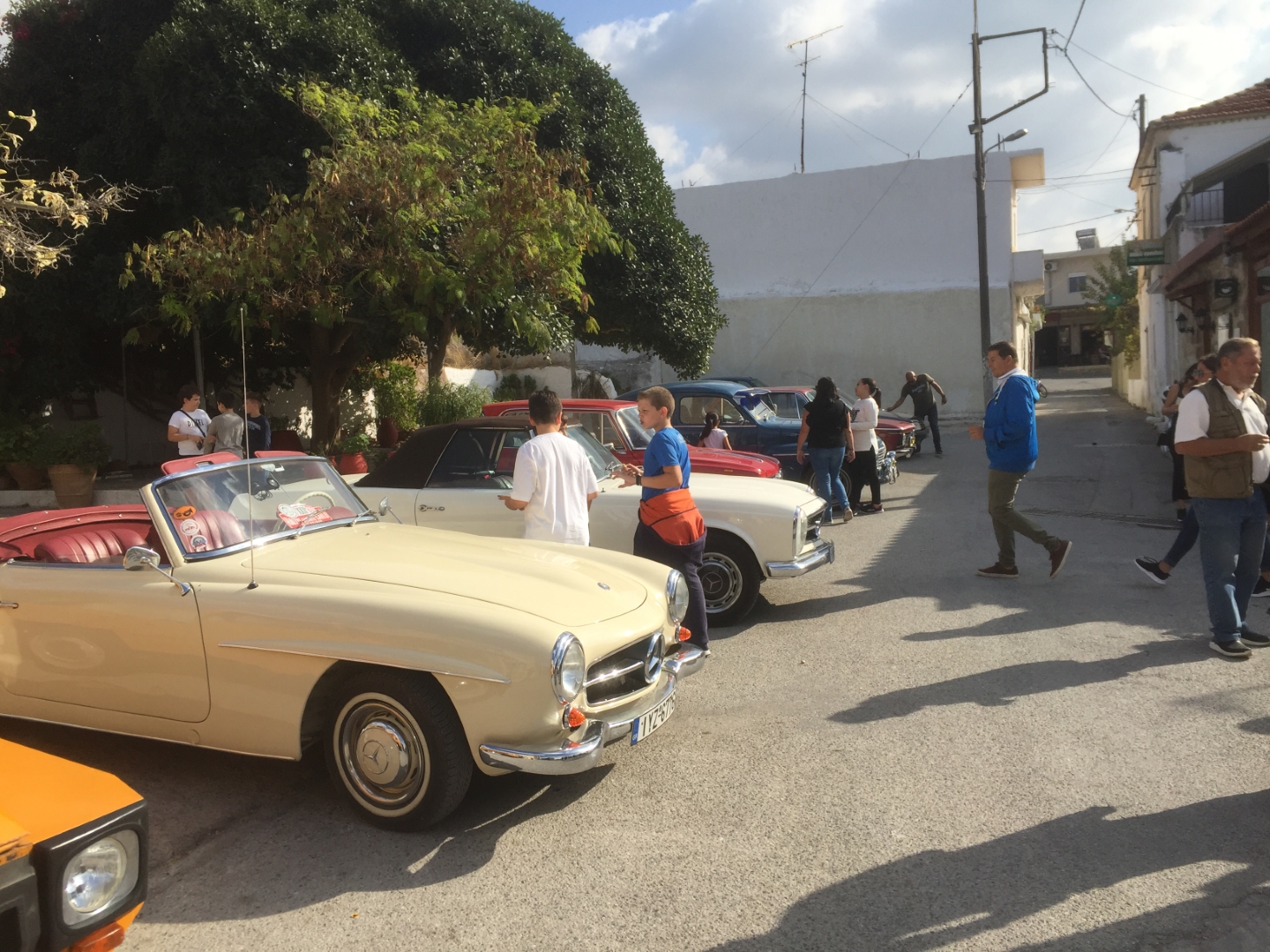 Οι κάτοικοι τούς καλωσόρισαν στην ηλιόλουστη πλατεία του χωριού με ρακές, χορούς και κεράσματα, ενώ φωτογραφήθηκαν δίπλα στις πανέμορφες αντίκες. Ανάμεσά τους ένα αγωνιστικό Volvo PV444 του 1950, μια Mercedes 190 SL W 121 του 1960, μια Mercedes «παγόδα» W113 280 SL του 1970, μια Alfa Romeo Giulia Super του 1970, μια BMV 1602 επίσης του 1970 και ένα Πόνυ Citroen του 1979.