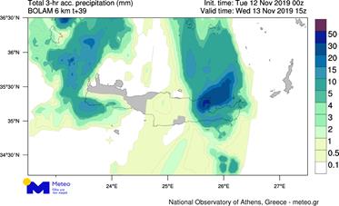 Οι 4 χάρτες που ακολουθούν δίνουν ενδεικτικά τα προβλεπόμενα ύψη βροχής σε επιλεγμένα τρίωρα διαστήματα της Τετάρτης. Κατά τη διάρκεια εξέλιξης του φαινομένου οι επιστήμονες του Εθνικού Αστεροσκοπείου/meteo.gr θα παρακολουθούν το φαινόμενο μέσω του πυκνού δικτύου αυτόματων σταθμών, δορυφορικών εικόνων και του συστήματος ΖΕΥΣ για την καταγραφή των κεραυνών.