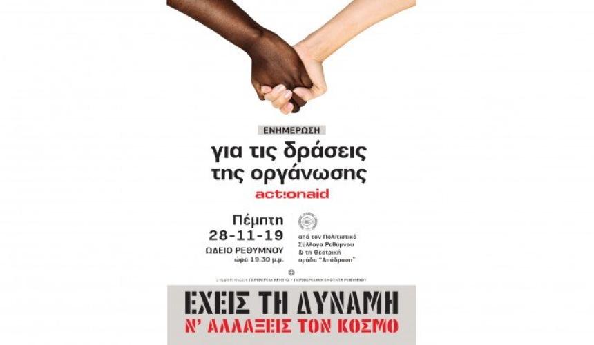 Την Πέµπτη 28-11-19 στο Ωδείο Ρεθύμνου και ώρα 19:30 µ.µ. θα υπάρξει ενημέρωση για τις δράσεις της οργάνωσης ACTIONAID