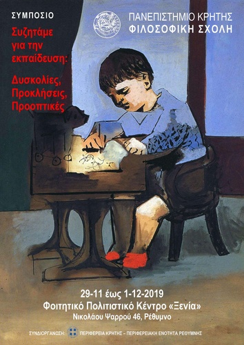 Η Φιλοσοφική Σχολή του Πανεπιστημίου Κρήτης, σε συνεργασία με την Περιφέρεια Κρήτης - Περιφερειακή Ενότητα Ρεθύμνης, διοργανώνει Συμπόσιο με τίτλο «Συζητάμε για την Εκπαίδευση: δυσκολίες, προκλήσεις, προοπτικές», το οποίο θα διεξαχθεί στο Φοιτητικό Πολιτιστικό Κέντρο «Ξενία», στο Ρέθυμνο. Οι εργασίες του Συμποσίου θα ξεκινήσουν την Παρασκευή 29 Νοεμβρίου στις 6 το απόγευμα και θα ολοκληρωθούν την Κυριακή 1η Δεκεμβρίου το μεσημέρι. Η εναρκτήρια συνεδρία θα αφορά γενικά ζητήματα εκπαίδευσης, ενώ οι συνεδρίες του Σαββάτου θα επικεντρωθούν στη διδασκαλία της γλώσσας, των φιλολογικών μαθημάτων και της φιλοσοφίας. Η συνεδρία της Κυριακής θα αφιερωθεί στην Ιστορία.