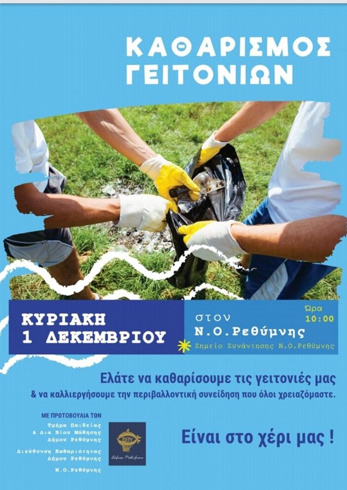 Μία ακόμη πρωτοβουλία με στόχο την καλλιέργεια περιβαλλοντικής συνείδησης στην πράξη, προστίθεται στο Περιβαλλοντικό Πρόγραμμα «Καθαρισμός Γειτονιών» που εγκαινίασε το Τμήμα Παιδείας, Δια Βίου Μάθησης & Κοινωνικής Πολιτικής του Δήμου Ρεθύμνης με επικεφαλής την αρμόδια Αντιδήμαρχο κα Αννα Ελευθεριάδου – Γκίκα, με την υποστήριξη της Υπηρεσίας Καθαριότητας, Αστικού Περιβάλλοντος και Πρασίνου του Δ.Ρ., εθελοντών, φορέων και Σωματείων της πόλης .