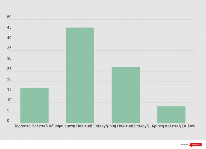 - Μεγάλο τμήμα από αυτό το ποσοστό επιδοκιμασίας,συμπληρώνει : ‘Είναι ανέλπιστο αυτό που είδαμε με την Κυβέρνηση Μητσοτάκη. Χαίρεσαι να κοιτάζεις τα στελέχη της όταν βγαίνουν στην τηλεόραση: Σοβαρός, μεστός πολιτικός λόγος, προσεκτικά, καλά προετοιμασμένα και μελετημένα βήματα (βλ. περίπτωση Εξαρχείων, Καταλήψεις στο κέντρο της Αθήνας, Οικονομικό Πανεπιστήμιο Αθηνών, Πανεπιστήμιο Θεσσαλονίκης, χειρισμός του προβλήματος της ΔΕΗκτλ), καθημερινή δουλειά, χαμηλούς τόνους, και με έκδηλη αγωνία να σωθεί η πατρίδα. Να μην ξαναγυρίσουμε στη μιζέρια της κρίσης και την υπανάπτυξη’.