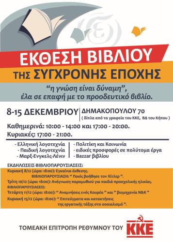 - Κυριακή 15 Δεκεμβρίου: 18:00 Βιβλιοπαρουσίαση: “Επιτεύγματα και Κατακτήσεις της Εργατικής Τάξης στο Σοσιαλισμό” του τμήματος της ΚΕ του ΚΚΕ για την εργατική συνδικαλιστική δουλειά.