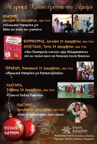 Οι χριστουγεννιάτικες εκδηλώσεις διοργανώνονται σε συνεργασία με τους Πολιτιστικούς Συλλόγους. Όλες οι εκδηλώσεις έχουν ενταχθεί στο πρόγραμμα των Πολιτιστικών Εκδηλώσεων του Δήμου Αμαρίου και έχουν ελεύθερη είσοδο.