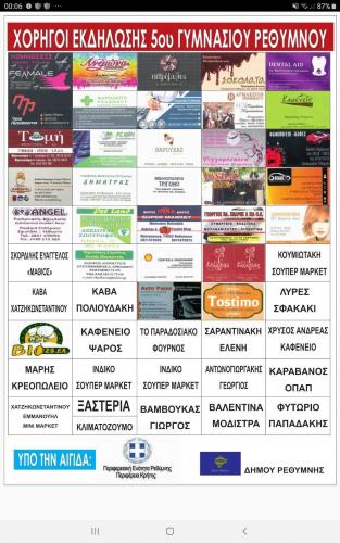 Η Σχολική Κοινότητα του 5ου Γυμνασίου ευχαριστεί θερμά την Περιφέρεια Κρήτης – Περιφερειακή Ενότητα Ρεθύμνου, τον Δήμο Ρεθύμνου και την ΚΕΔΗΡ, τις Τοπικές Κοινότητες Παγκαλοχωρίου και Χαμαλευρίου, τους χορηγούς της διοργάνωσης, μεταξύ των οποίων ο Πολιτιστικός Σύλλογος Σταυρωμένου και ο φούρνος Μεταξάκη, καθώς επίσης και όλους τους συντελεστές για την πολύτιμη συνδρομή και βοήθειά τους.