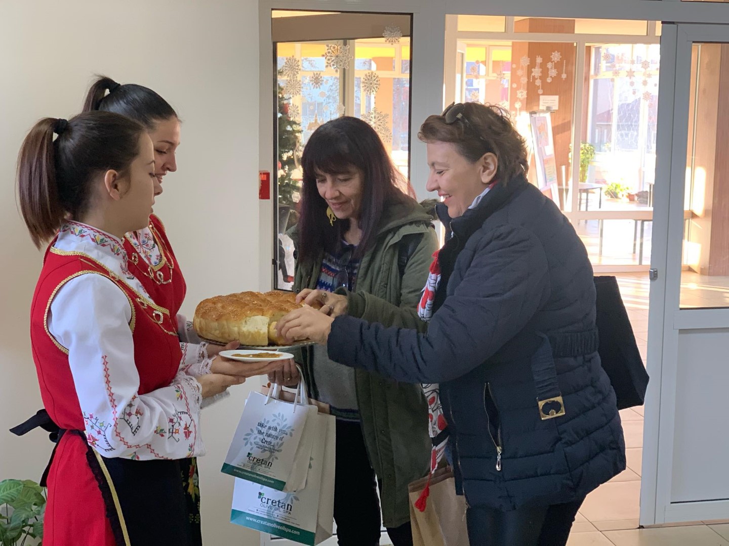 Οι Βούλγαροι συνάδελφοι και μαθητές μάς υποδέχτηκαν με τον παραδοσιακό τους τρόπο, προσφέροντάς μας ψωμί και αλάτι, και στη συνέχεια τα θεατρικά παιχνίδια γνωριμίας στα οποία συμμετείχαν εκπαιδευτικοί και μαθητές δημιούργησαν ένα ομαδικό και συνεργατικό κλίμα. Επίσης η γνωριμία με τους χώρους του σχολείου, τα παραδοσιακά όργανα, τη μουσική, τα τραγούδια και τους χορούς αλλά και τα παραδοσιακά φαγητά (tarator, banitsa, selskikartofi, garashcake κτλ.) βοήθησε να έρθουμε σε στενότερη επαφή με την κουλτούρα και τους ανθρώπους της χώρας που μας φιλοξένησε. Στη συνέχεια, στο πλαίσιο των πολιτιστικών ανταλλαγών, κάθε χώρα από τους εταίρους παρουσίασε τους δικούς της παραδοσιακούς χορούς, τη μουσική και τα τραγούδια της, ώστε μέσα από την ανάδειξη των διαφορών να διαμορφωθεί μια αμοιβαία εκτίμηση και σεβασμός στην κουλτούρα της κάθε χώρας – εταίρου.