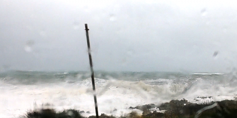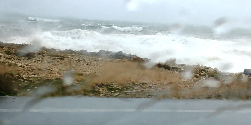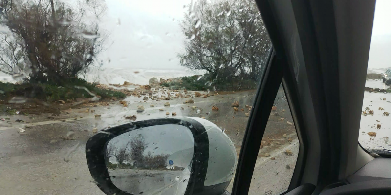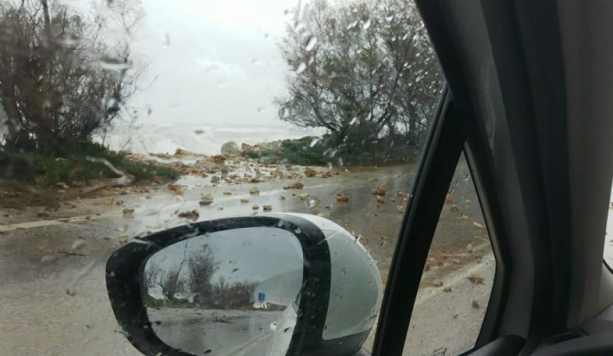 Το αποτέλεσμα ήταν να έχει γεμίζει το οδόστρωμα με πέτρες και βότσαλα από την παρακείμενη παραλία, ενώ από την άλλη πλευρά έπεφταν και πέτρες από τα υψώματα.