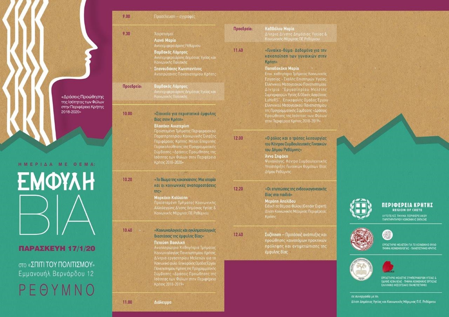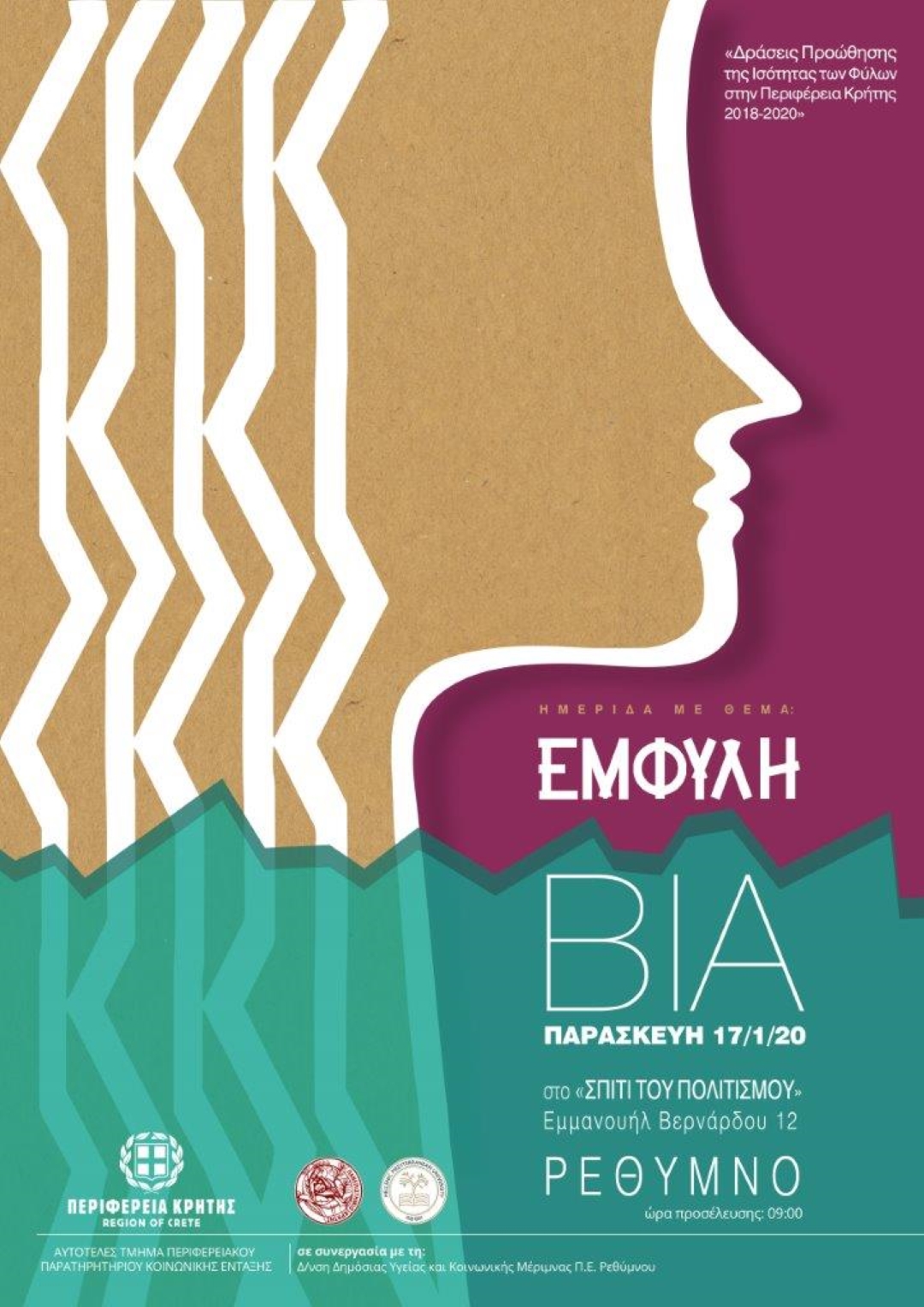 Η Περιφέρεια Κρήτης (Αυτοτελές Τμήμα Περιφερειακού Παρατηρητηρίου Κοινωνικής Ένταξης σε συνεργασία με τη Δ/νση Δημόσιας Υγείας & Κοινωνικής Μέριμνας της Π.Ε. Ρεθύμνου) διοργανώνει ημερίδα με τίτλο, «Έμφυλη Βία», στο πλαίσιο του προγράμματος «Δράσεις Προώθησης Ισότητας των Φύλων στην Περιφέρεια Κρήτης 2018 - 2020» με τη σύμπραξη του Ελληνικού Μεσογειακού Πανεπιστημίου και του Πανεπιστημίου Κρήτης, την Παρασκευή, 17 Ιανουαρίου 2020, ώρα 09:00-14:00, στο «Σπίτι του Πολιτισμού», Εμμανουήλ Βερνάρδου 12, στο Ρέθυμνο.