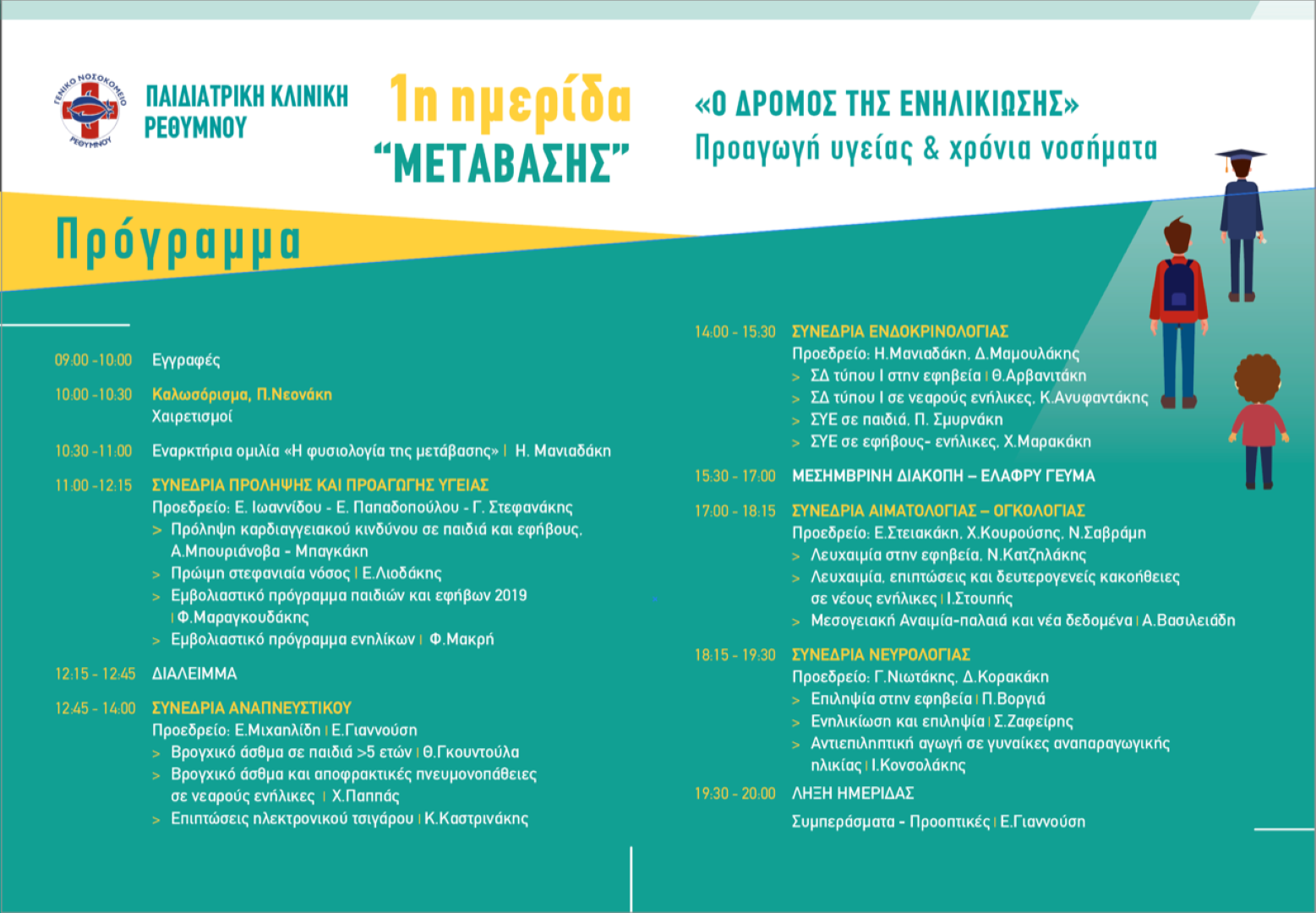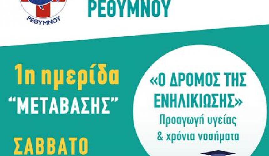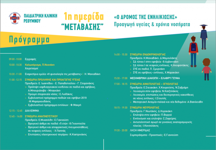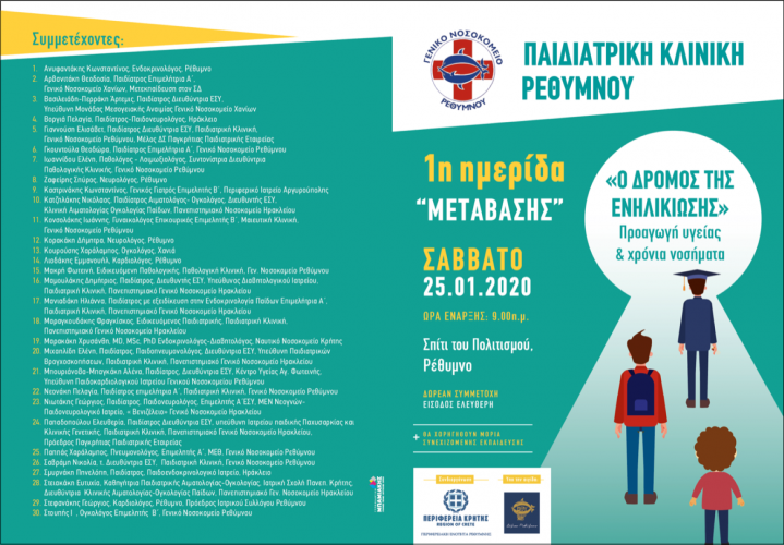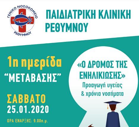 Με ιδιαίτερη χαρά η Παιδιατρική Κλινική του Νοσοκομείου Ρεθύμνου ανακοινώνει την διοργάνωση της 1ης επιστημονικής Ημερίδας Μετάβασης με τίτλο: «ο Δρόμος της Ενηλικίωσης: Προαγωγή Υγείας και Χρόνια Νοσήματα». Η ημερίδα θα διεξαχθεί το Σάββατο 25/1/2020 στο Σπίτι του Πολιτισμού 10:00-21:00 με δωρεάν εγγραφή για τους επαγγελματίες υγείας και ελεύθερη παρακολούθηση για το κοινό.