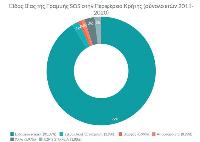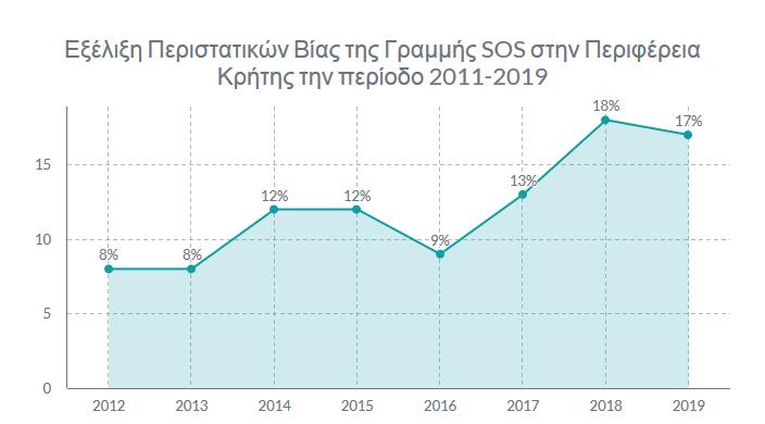 Σύμφωνα με στοιχεία που παρουσίασε η προϊσταμένη του Παρατηρητηρίου Κοινωνικής Ένταξης της Περιφέρειας Κρήτης (Παρατηρητήριο), Βλασάκη Κατερίνα, τα οποία διέθεσε στο Παρατηρητήριο η «Γραμμή SOS (15900)» της Γενικής Γραμματείας Οικογενειακής Πολιτικής και Ισότητας των Φύλων του Υπουργείου Εργασίας και Κοινωνικών Υποθέσεων, 1237 περιστατικά έμφυλης βίας έχουν καταγραφεί συνολικά για την Κρήτη, την περίοδο 2011-2019. Η μεγαλύτερη αύξηση τέτοιων περιστατικών εντοπίζεται στα έτη 2018 και 2019.