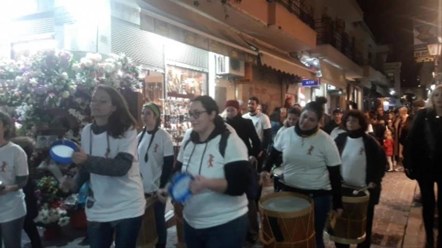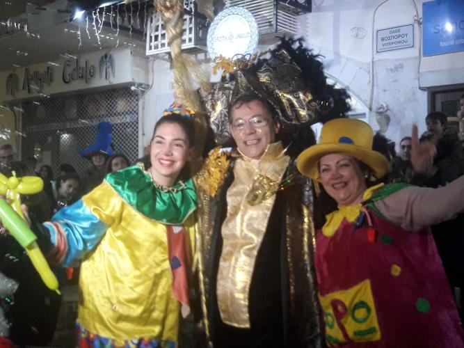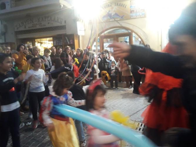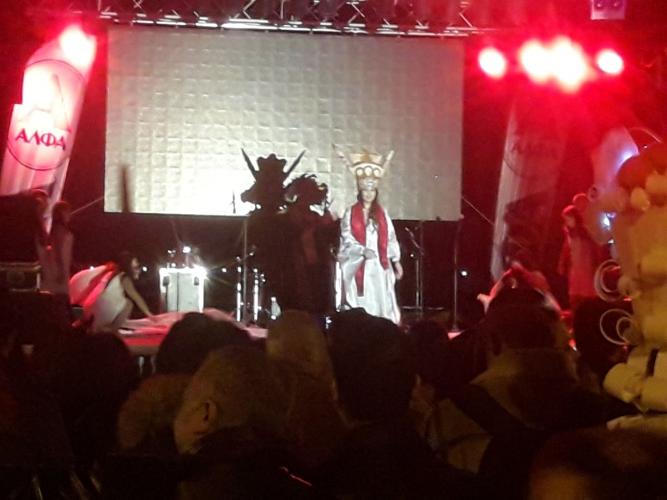 Αμέσως μετά ο Βασιλιάς Καρνάβαλος, με το μικρό Καρναβαλάκι, ξεκίνησε την πορεία του στους δρόμους της π. Πόλης, καταλήγοντας στην παραλία, στη θέση Λαβύρινθος όπου, παρουσιάστηκε ένα σόου, προοίμιο της θεματικής του φετινού Καρναβαλιού.