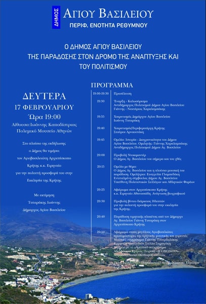 Στην εκδήλωση θα παρουσιαστούν μέσα από ομιλίες και οπτικοακουστικό υλικό οι σημαντικότερες στιγμές της μακρόχρονης πορείας της τέως Επαρχίας και νυν Δήμου ‘Αγίου Βασιλείου’ τόσο στο ιστορικό γίγνεσθαι όσο και στον πολιτισμό, τα γράμματα και τις τέχνες.