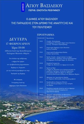 Σε αυτό το πλαίσιο ο Δήμος Αγίου Βασιλείου διοργανώνει στην Αθήνα, στις 17 Φεβρουαρίου 2020, ημέρα Δευτέρα και ώρα 19:30 στην αίθουσα ‘Ιωάννης Καποδίστριας’ του Πολεμικού Μουσείου, εκδήλωση με τίτλο «Ο Δήμος Αγίου Βασιλείου της παράδοσης, στον δρόμο της ανάπτυξης και του πολιτισμού».