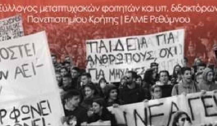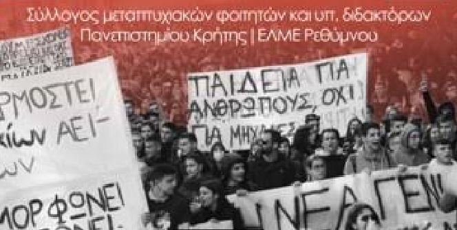Όλοι και όλες στην εκδήλωση του Ενιαίου Συλλόγου Μεταπτυχιακών και Υποψηφίων Διδακτόρων Πανεπιστημίου Κρήτης και της ΕΛΜΕ Ρεθύμνου την Παρασκευή στις 21 Φεβρουαρίου στις 19:00 στο Στέκι των Καθηγητών (Ηλιάκη 16).