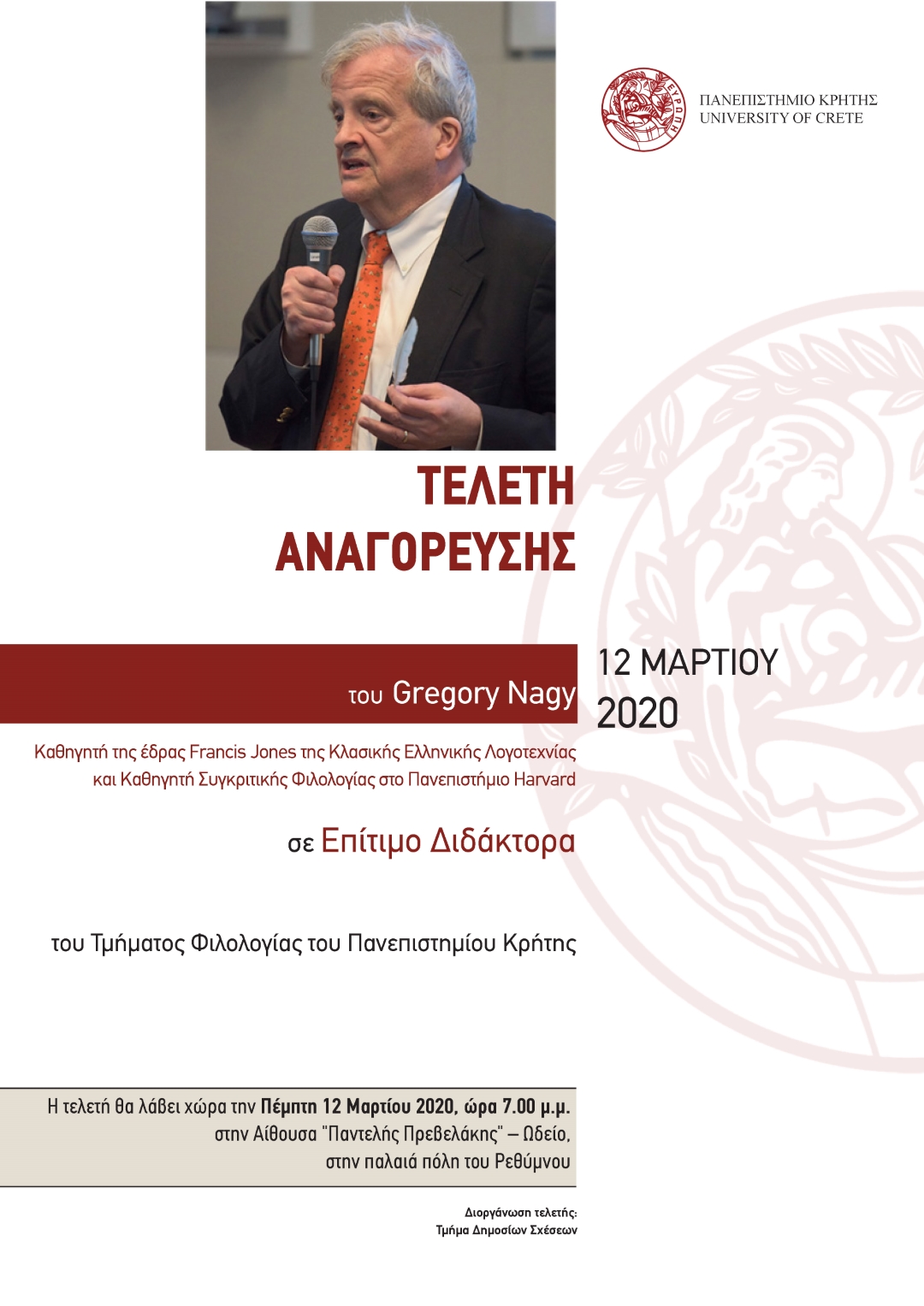 Το Πανεπιστήμιο Κρήτης και το Τμήμα Φιλολογίας αναγορεύουν τον διαπρεπή καθηγητή Κλασικών Σπουδών του Harvard και διευθυντή του Κέντρου Ελληνικών Σπουδών, Gregory Nagy, Επίτιμο Διδάκτορα του Τμήματος Φιλολογίας, την Πέμπτη 12 Μαρτίου, ώρα 7.00 μ.μ., στην Αίθουσα "Παντελής Πρεβελάκης" – Ωδείο, στην παλαιά πόλη του Ρεθύμνου.