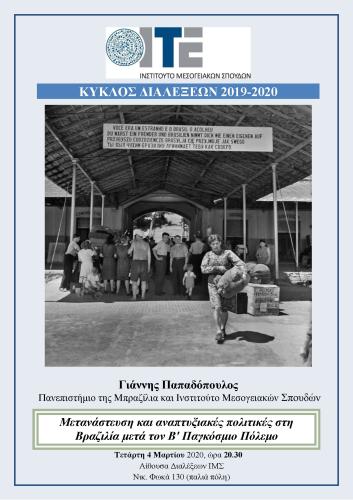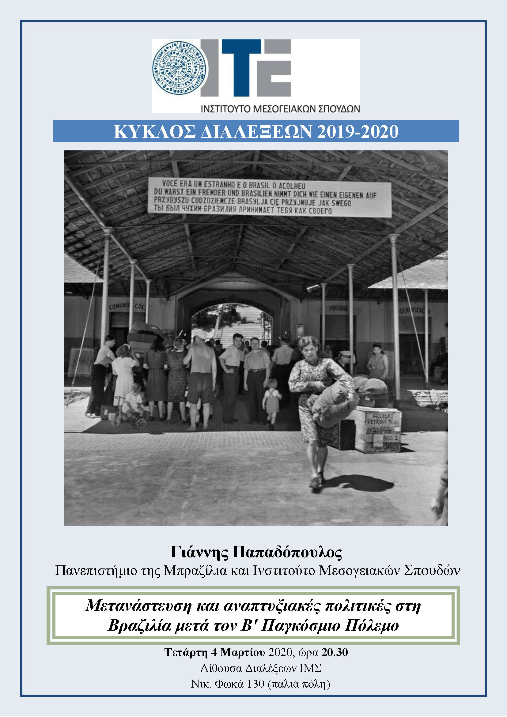 Την Τετάρτη 4 Μαρτίου, ώρα 20.30, στο Ινστιτούτο Μεσογειακών Σπουδών (Μελισσινού και Νικηφόρου Φωκά 130) θα γίνει η διάλεξη του ιστορικού Γιάννη Παπαδόπουλου με τίτλο «Μετανάστευση και αναπτυξιακές πολιτικές στη Βραζιλία μετά τον Β' Παγκόσμιο Πόλεμο».