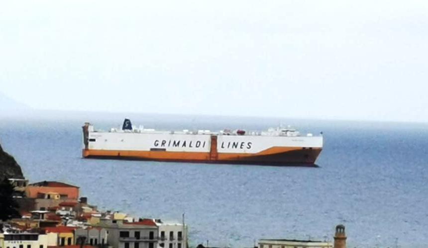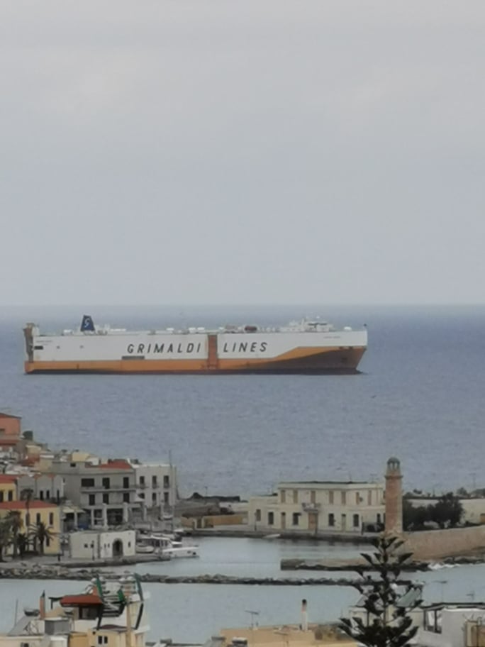 Στην αναμονή για αναχώρηση βρίσκεται το πλοίο των Grimaldi Lines που από βρίσκεται από τις πρώτες πρωινές ώρες της 25ης Μαρτίου αγκυροβολημένο ανοιχτά της πόλης του Ρεθύμνου.