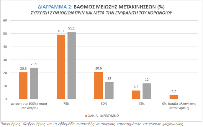 το 90.2% ελάττωσε τις καθημερινές μετακινήσεις του κατά τουλάχιστον 50% (88.0% για το Ρέθυμνο και 90.3% για τα Χανιά)