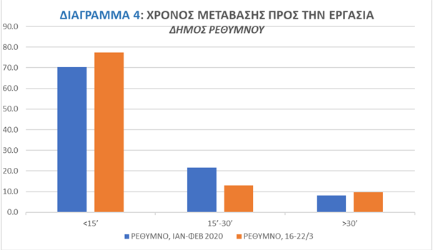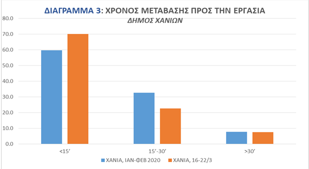Όπως ήταν αναμενόμενο, λόγω της μειωμένης κίνησης, παρατηρήθηκε σημαντική μείωση του απαιτούμενου χρόνου για τη μετάβαση στην εργασία τους των πολιτών που συμμετείχαν στην έρευνα τόσο στο Δήμο Χανίων όσο και στο Δήμο Χανίων. Το 70% των συμμετεχόντων από τα Χανιά και το 77.4% από το Ρέθυμνο χρειάστηκαν μόλις 15 λεπτά για τη μετάβαση τους στην εργασία κατά την εβδομάδα 16-22 Μαρτίου. Το ποσοστό αυτό ήταν 59.7% και 70.3 αντίστοιχα για το διάστημα Ιανουαρίου-Φεβρουαρίου.