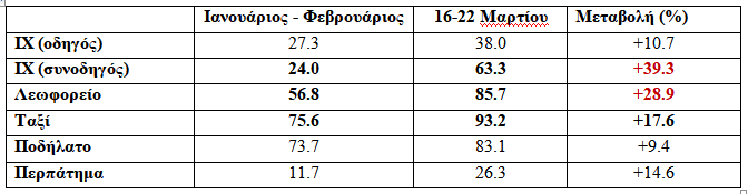 Αντίστοιχα, σημαντική ήταν η επίπτωση στα μέσα μαζικής μεταφοράς (λεωφορείο), το οποίο απέφυγαν 28.9% περισσότεροι πολίτες από αυτούς που δεν το χρησιμοποίησαν κατά το προηγούμενο δίμηνο (Ιανουάριος-Φεβρουάριος)