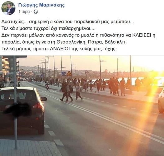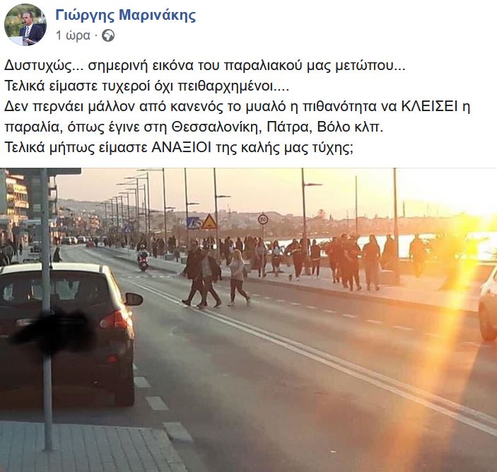 Κάθε άλλο παρά εικόνα πόλης που βρίσκεται εν μέσω μέτρων απαγόρευσης, λόγω του κορωνοϊού, θύμιζε ο παραλιακός δρόμος του Ρεθύμνου γεγονός που "ξεσήκωσε" ακόμα και σχόλιο του Δημάρχου της πόλης, Γιώργου Μαρινάκη στη σελίδα του στο Facebook:
