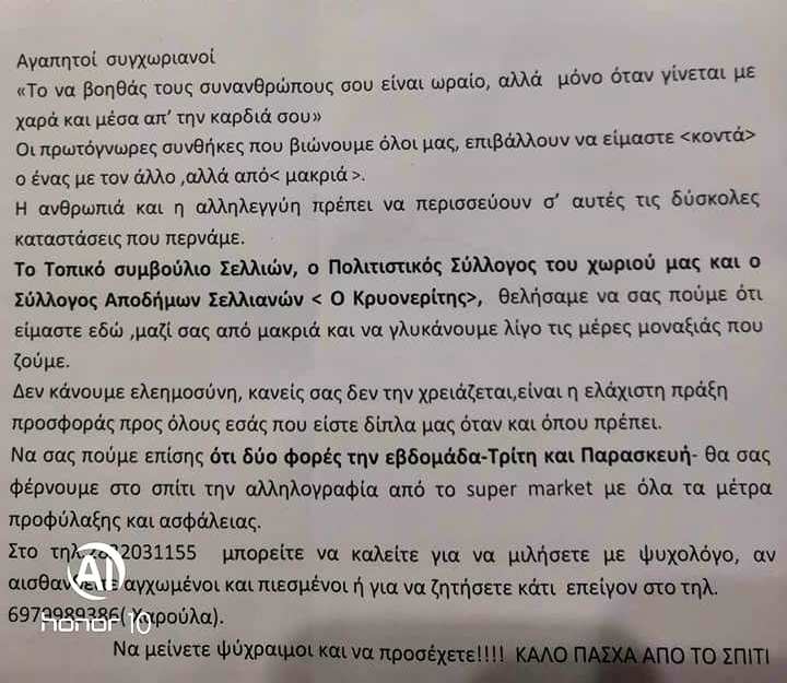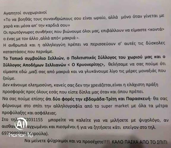 Σε μια συγκινητική πρωτοβουλία αλληλεγγύης προχώρησαν τα μέλη του Πολιτιστικού Συλλόγου Σελλίων Δήμου Αγίου Βασίλειου Ρεθύμνης, σε συνεργασία με την τοπική κοινότητα και τον Σύλλογο Αποδήμων Σελλιανών "Κρυονερίτης". Για να δείξουν στους συγχωριανούς τους πως δεν είναι κάθε ένας μόνος του στο σπίτι του μέσα σε αυτή την συγκυρία αλλά όλοι νοιάζονται για όλους, έφτιαξαν συμβολικές συσκευασίες με δώρα και τα μοίρασαν σε κάθε σπίτι του χωριού.