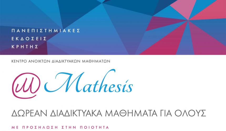 Το Mathesis είναι το πρώτο κέντρο διαδικτυακών μαθημάτων στη χώρα, που ιδρύθηκε το 2015. Είναι ένα αυτόνομο τμήμα των Πανεπιστημιακών Eκδόσεων Κρήτης του Ιδρύματος Τεχνολογίας και Έρευνας. Σκοπός του είναι να προσφέρει στον Έλληνα πολίτη ποιοτικά, διαδικτυακά μαθήματα στο ύψος των καθιερωμένων διεθνών προτύπων. Τα μαθήματα του Mathesis που τώρα προσφέρονται, καλύπτουν τομείς όπως Ιστορία, Φιλοσοφία, Πληροφορική, Αστρονομία και Φυσική και οι διδάσκοντες είναι αναγνωρισμένοι ακαδημαϊκοί δάσκαλοι από όλα τα πανεπιστήμια της χώρας. Μέχρι σήμερα έχουν δημιουργηθεί 38 μαθήματα, έχουν εγγραφεί 70.000 πολίτες και έχουν εκδοθεί 42.000 βεβαιώσεις επιτυχούς παρακολούθησης.