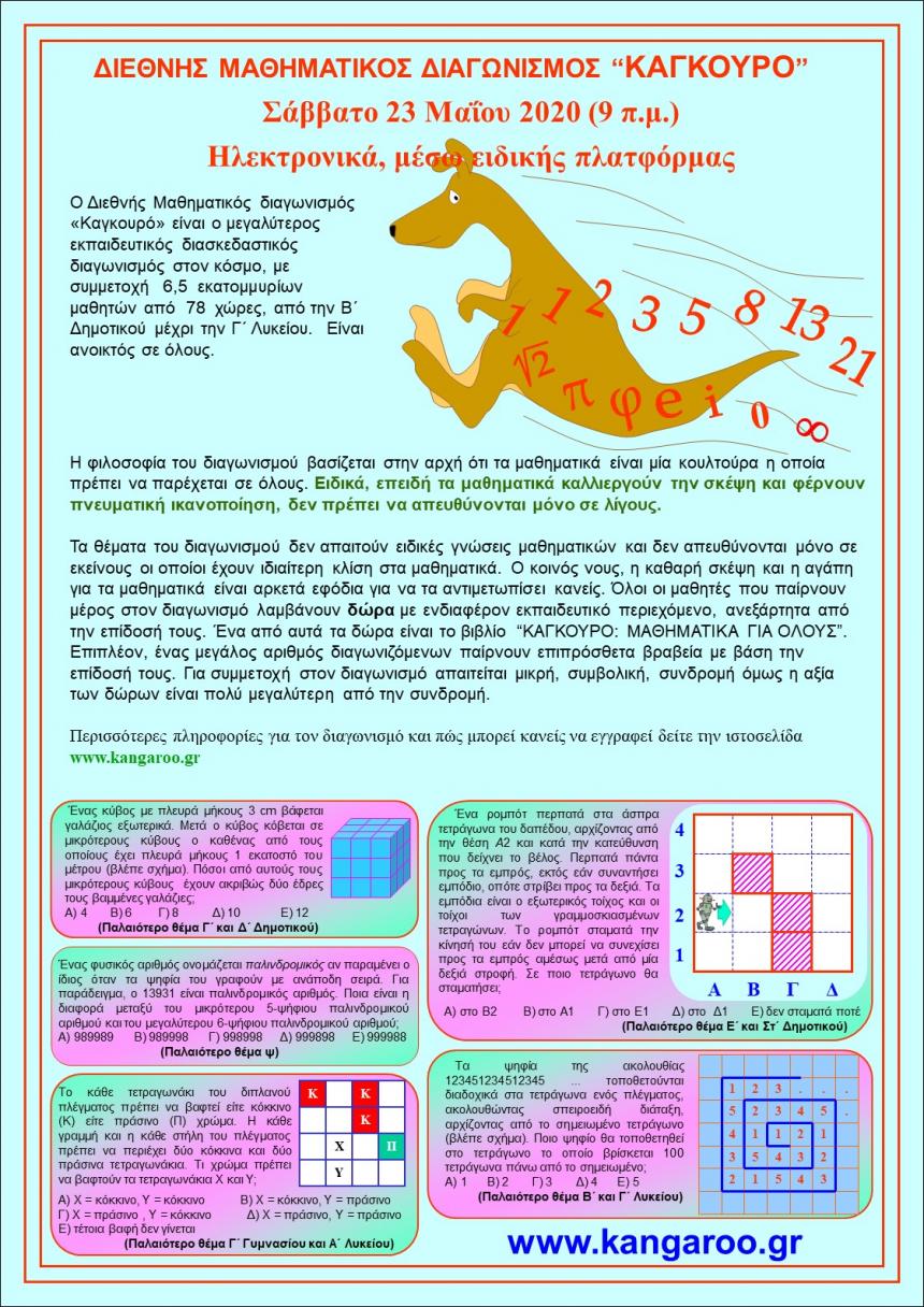 Ο μαθηματικός διαγωνισμός «Καγκουρό» είναι ένας διεθνής εκπαιδευτικός διαγωνισμός, που στηρίζεται στη φιλοσοφία ότι τα Μαθηματικά είναι μία κουλτούρα η οποία πρέπει να παρέχεται σε όλους, επειδή καλλιεργούν την σκέψη και φέρνουν πνευματική ικανοποίηση σε όσους εμπλέκονται με αυτά. Στον διαγωνισμό μπορούν να λάβουν μέρος όλοι οι μαθητές από την Β΄ Δημοτικού μέχρι την Γ΄ Λυκείου, ανεξάρτητα από το τύπο ή τη μορφή του Σχολείου τους (Δημόσιο, Ιδιωτικό, κ.λπ.). Τα θέματα στα οποία διαγωνίζονται δεν απαιτούν ειδικές γνώσεις μαθηματικών και δεν απευθύνονται μόνο σε μαθητές με ιδιαίτερη κλίση στα Μαθηματικά. Ο κοινός νους, η καθαρή σκέψη και η αγάπη για τα Μαθηματικά είναι αρκετά εφόδια για να αντιμετωπίσει κανείς τα θέματα του διαγωνισμού.
