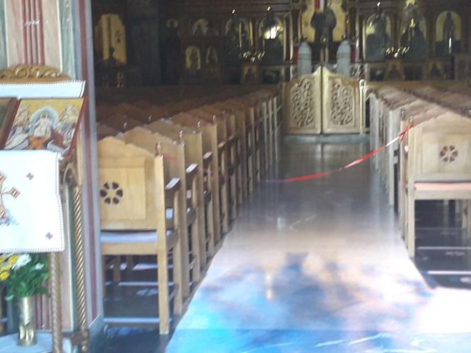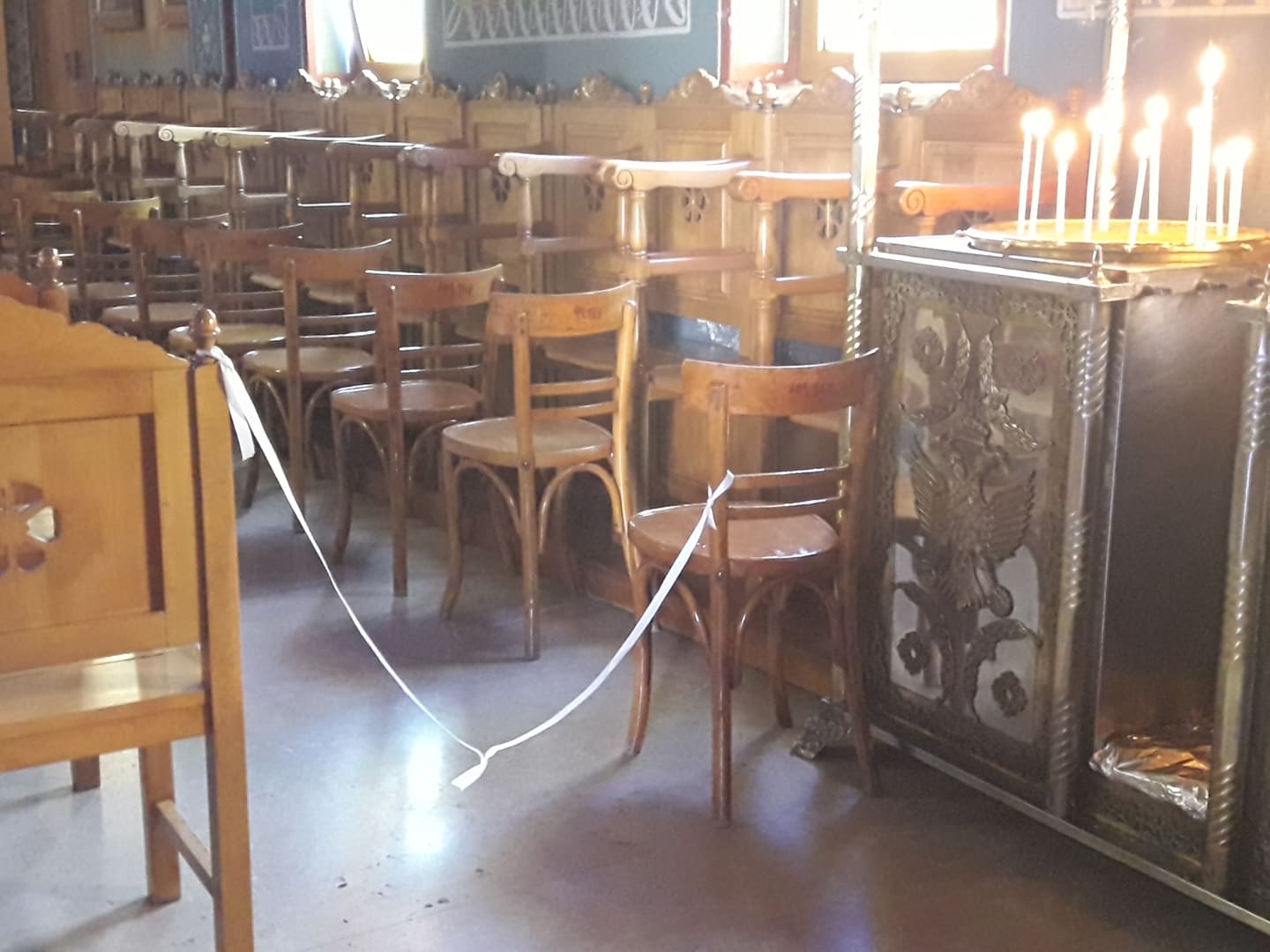 Όπως διαπιστώθηκε επίσης, στον ναό των 4ων Μαρτύρων έχουν τοποθετηθεί και κορδέλες που απαγορεύουν τη διέλευση των πιστών προς τα καθίσματα, κρατώντας ανοιχτό το κομμάτι γύρω από το παγκάρι και τα προσκυνητάρια .