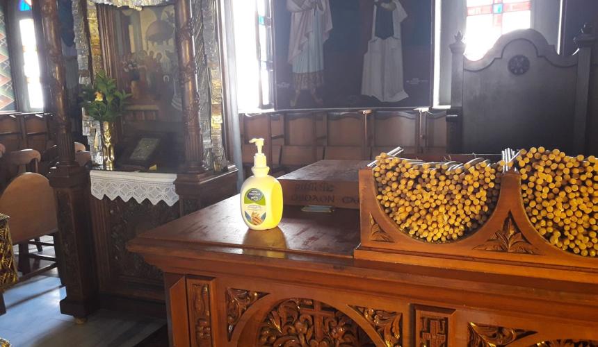 Με αντισηπτικά στα παγκάρια, δίπλα στα κεριά, υποδέχονται τους πιστούς οι περισσότεροι από τους ναούς της πόλης, αφού όπως διαπιστώθηκε ελάχιστοι είναι εκείνοι που δεν έχουν ακόμα προμηθευτεί τα απαραίτητα για την αντισηψία των πιστών, που φτάνουν στους ναούς για ν’ ανάψουν ένα κερί και να κάνουν την ατομική τους προσευχή.