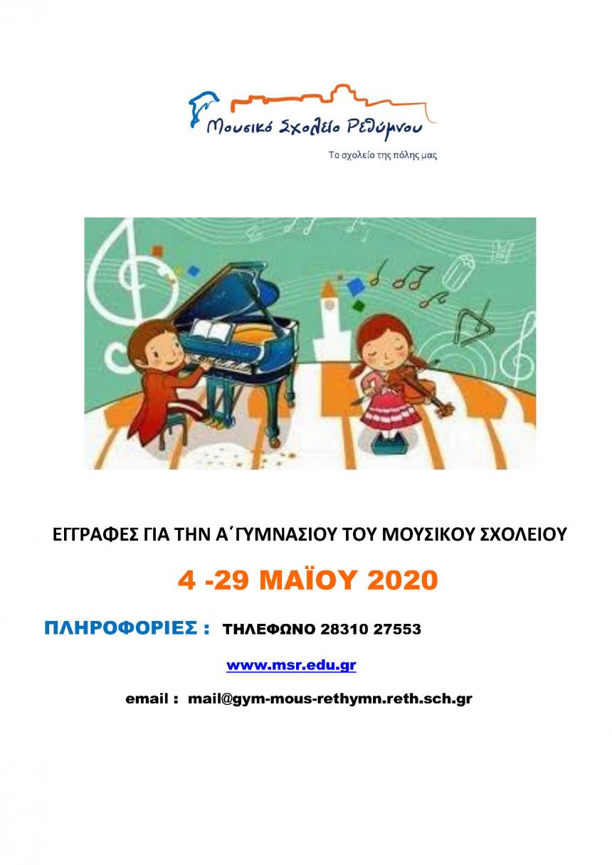 Το Μουσικό Σχολείο Ρεθύμνου ενημερώνει ότι οι εγγραφές για την Α΄ Γυμνασίου του Σχολικού έτους 2020-2021, πραγματοποιούνται από 4 έως και 29 Μαΐου. Όσοι γονείς επιθυμούν να εγγράψουν τα παιδιά τους στο Μουσικό Σχολείο Ρεθύμνου πρέπει να υποβάλλουν για πρώτη φορά φέτος ηλεκτρονική αίτηση εγγραφής στο email του Μουσικού Σχολείου ( mail@gym-mous-rethymn.reth.sch.gr)