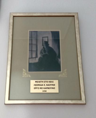 Φεύγοντας ο Μανώλης Κούνουπας και μένοντας πια μόνοι μας, άρχισε πάλι ο κ. Λεωνίδας να σκαλίζει τις αναμνήσεις του. Και όλες κατέληγαν στον «μπαμπά» του. Φεύγοντας μου έκανε ένα μοναδικό δώρο. Ένα ζωγραφικό έργο του ίδιου, κορνιζαρισμένο και με αναμνηστική μεταλλική πλακέτα. Δώρο ανεκτίμητο, που από τότε κοσμεί τον τοίχο του σπιτιού μου.