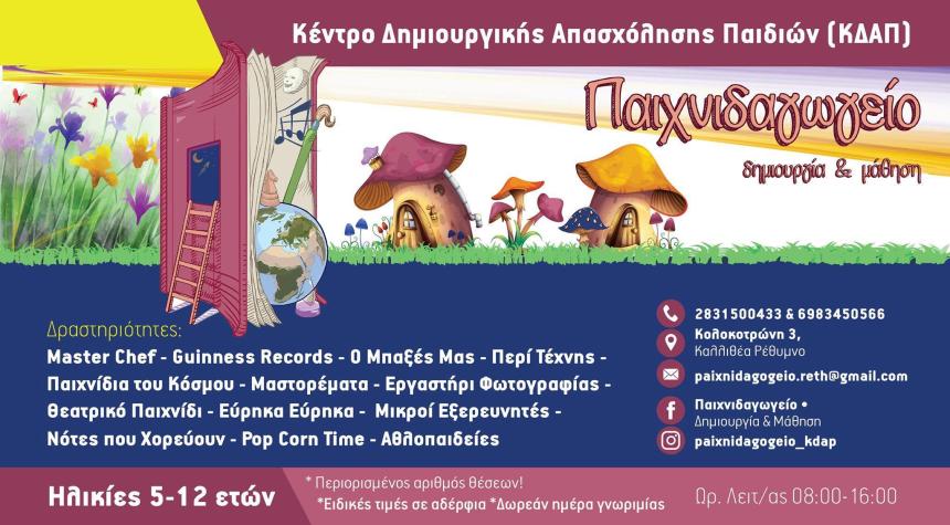 Από την 1η Ιουνίου και για όλους τους Καλοκαιρινούς μήνες (Ιούνιο - Ιούλιο - Αύγουστο) θα δημιουργούνται τμήματα δημιουργικής απασχόλησης για παιδιά ηλικίας από 5 έως 12 ετών!