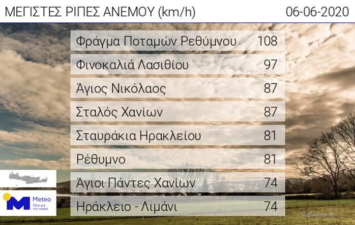 Όπως είχαμε ενημερώσει από την Παρασκευή, θυελλώδεις νότιοι άνεμοι πνέουν στην Κρήτη τις πρωινές ώρες του Σαββάτου 06/06. Οι 8 μεγαλύτερες ριπές ανέμου που κατέγραψαν οι σταθμοί του δικτύου του Εθνικού Αστεροσκοπείου Αθηνών/meteo.gr δίνονται στον πίνακα που ακολουθεί.