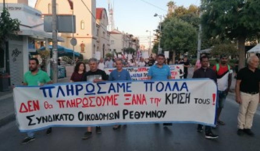 Με ένα μαχητικό συλλαλητήριο ένωσαν τη φωνή τους εργαζόμενοι από Δημόσιο και Ιδιωτικό τομέα απαιτώντας να μην ξαναπληρώσουν τη καπιταλιστική οικονομική κρίση. Στη συγκέντρωση και στην πορεία , συμμετείχαν το Συνδικάτο Οικοδόμων Ρεθύμνου, το σωματείο Καθαριστριών , η ΈΛΜΕΡ, η επιτροπή αγώνα ιδιωτικών υπαλλήλων, η επιτροπή αγώνα επισιτισμού τουρισμού και ο σύλλογος γυναικών Ρέθυμνου