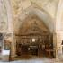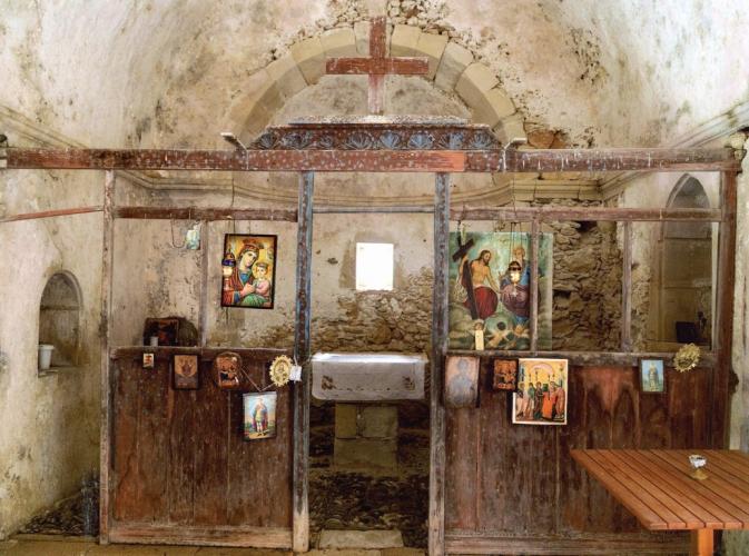Το εσωτερικό του ναού στα δυτικά εφάπτεται σε σπήλαιο. Επίσης σώζεται τμήμα των τοιχογραφιών (Ασπασμός Πέτρου και Παύλου, Παναγία σε Θρόνο, μοναστές άγιοι κλπ) που δεικνύουν ότι ο δημιουργός τους ακολουθεί τις τάσεις της Κρητικής Σχολής Αγιογραφίας με κάποιες δυτικές επιδράσεις.