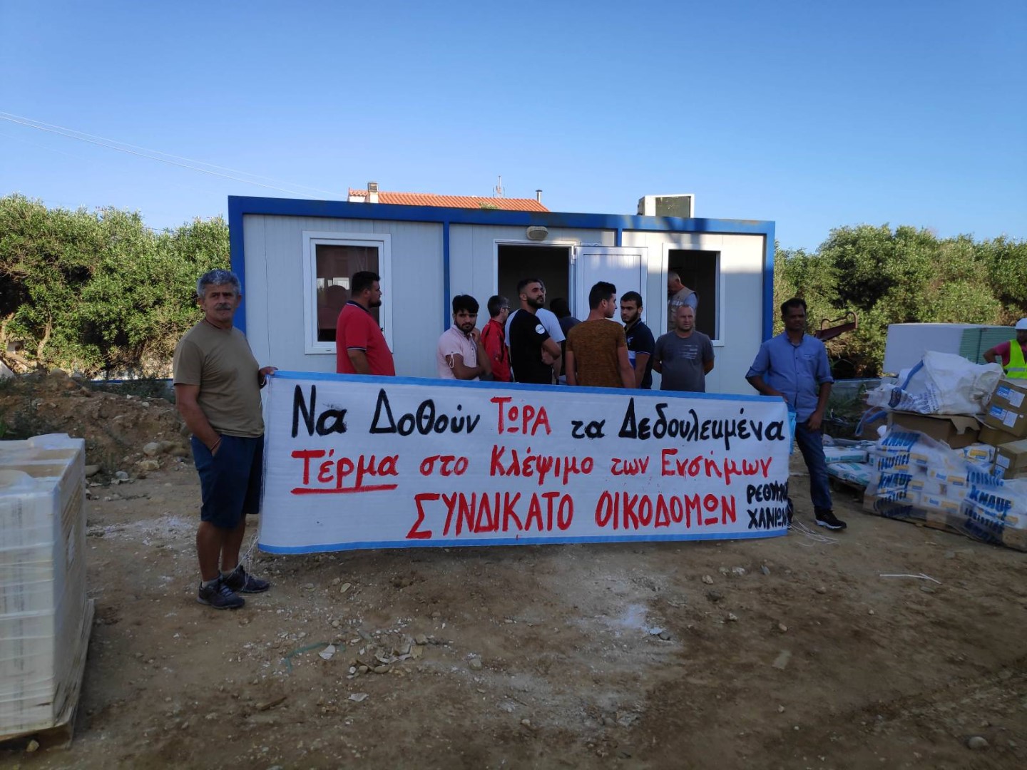 Το Συνδικάτο Οικοδόμων Ρεθύμνου μαζί με το συνδικάτο Οικοδόμων Χανίων πραγματοποίησε χτες παράσταση διαμαρτυρίας στο εργοτάξιο ανέγερσης μεγάλης ξενοδοχειακής μονάδας στον πλατανιά Χανίων και στο Πολυτεχείο Χανίων διεκδικώντας την πληρωμή των δεδουλευμένων τους και το πέρασμα των ενσήμων. Στα συγκεκριμένα εργοτάξια δούλεψαν και αρκετοί συνάδελφοι μέλη του Συνδικάτου Οικοδόμων από το Ρέθυμνο .