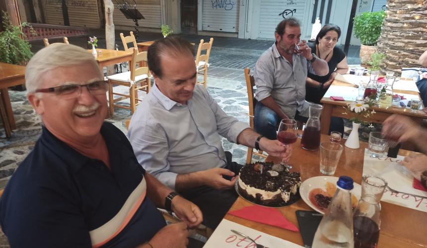 Η συνάντηση ήταν στην ταβέρνα του Όθωνα στην παλιά πόλη για μια τσικουδιά. Αλλά όλοι ήξεραν πως είχε γενέθλια και δεν άργησε να εμφανιστεί η τούρτα στο τραπέζι με το καθιερωμένο τραγούδι.
