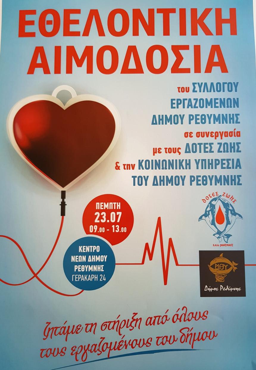 Εθελοντική αιμοδοσία διοργανώνει ο Σύλλογος Εργαζομένων Δήμου Ρεθύμνης σε συνεργασία με την Κοινωνική Υπηρεσία του Δ.Ρ και το Σύλλογο «Δότες Ζωής» Ρεθύμνου.