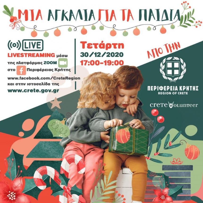 Στις φετινές γιορτές, η Περιφέρεια Κρήτης με προτεραιότητα την ασφάλεια και την προστασία των συνανθρώπων μας, «ανοίγει την αγκαλιά» της σε όλα τα παιδιά, τους πρωταγωνιστές αυτών των ημερών, μέσα από μια διαδικτυακή εκδήλωση για μικρά παιδιά, η οποία θα προβληθεί την Τετάρτη 30 Δεκεμβρίου στις 17:00, με τη συμμετοχή εθελοντικών φορέων, αθλητικών σωματείων και άλλων οργανώσεων.