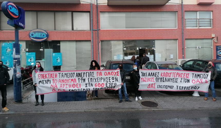 Με παράσταση διαμαρτυρίας στον ΟΑΕΔ Ρεθύμνου, τη Τετάρτη 27.01 , εργαζόμενοι και συνδικαλιστές που συσπειρώνονται στη ΔΑΣ επισιτισμού- τουρισμού απαίτησαν ταμείο ανεργίας για όλους. Πιο συγκεκριμένα ανέδειξαν την ανάγκη άμεσων προσλήψεων προσωπικού στον ΟΑΕΔ ώστε να σταματήσουν οι απαράδεκτες καθυστερήσεις πληρωμών ταμείου που φέτος έφτασαν έως και τρεις μήνες. Να επεκταθεί το επίδομα για όλους τους ανέργους μέχρι να ανοίξουν οι επιχειρήσεις. Να αυξηθεί στα 600 ευρώ. Χαρακτηριστικά αναδείχθηκε και στη κινητοποίηση το παράδειγμα συναδέλφισσας που δεν λαμβάνει επιδότηση για 5 ένσημα! ή η περίπτωση άλλης συναδέλφισσας που η αίτηση της για επιδότηση απορρίφθηκε γιατί ενώ είχε συμπληρώσει τα 50 ένσημα που είναι το φετινό όριο, αυτά δεν είναι αρκετά γιατί είναι η πρώτη της χρονιά επιδότησης!!!