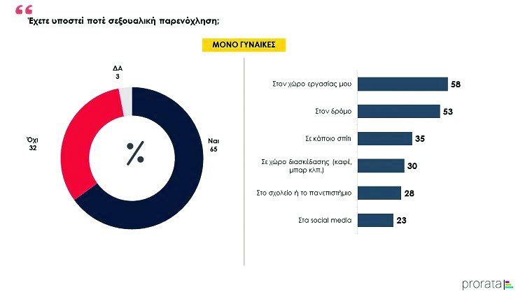 Πιο συγκεκριμένα, το 65% των γυναικών δηλώνει ότι έχει υπάρξει θύμα σεξουαλικής παρενόχλησης ή κακοποίησης με τους χώρους εργασίας και τα περιστατικά στον δρόμο να αποτελούν τα πιο συνηθισμένα μέρη στα οποία βιώνονται οι επιθέσεις.