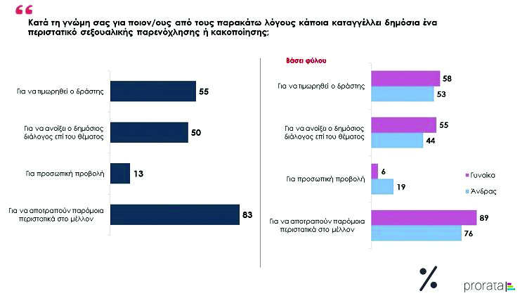 Οι περισσότεροι συμμετέχοντες δηλώνουν πως κατά την άποψη τους ο κύριος λόγος για τον οποίο μια γυναίκα καταγγέλλει δημόσια ένα περιστατικό παρενόχλησης ή κακοποίησης είναι ώστε να αποτραπούν παρόμοια περιστατικά στο μέλλον. Παράλληλα, οι ερωτώμενοι συμμερίζονται με τρόπο καθολικό (87%) την άποψη ότι δεν είναι καθόλου εύκολο ή όχι ιδιαίτερα εύκολο να δικαιωθεί μια γυναίκα που έχει υπάρξει θύμα σεξουαλικής παρενόχλησης ή κακοποίησης.