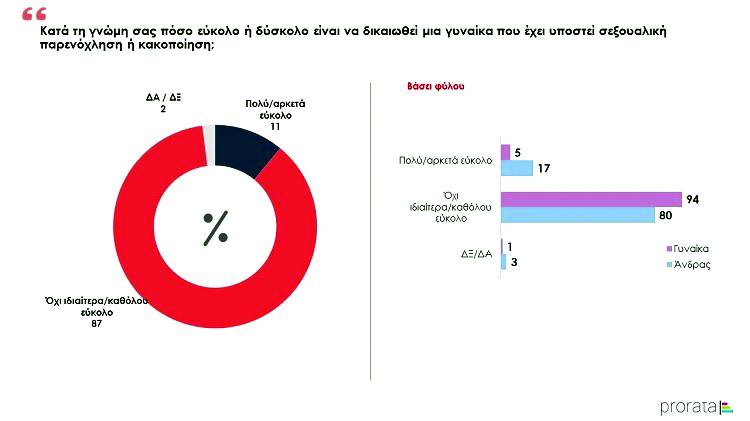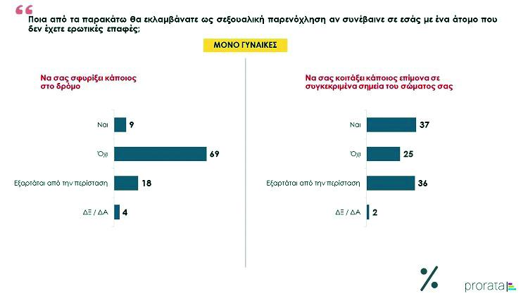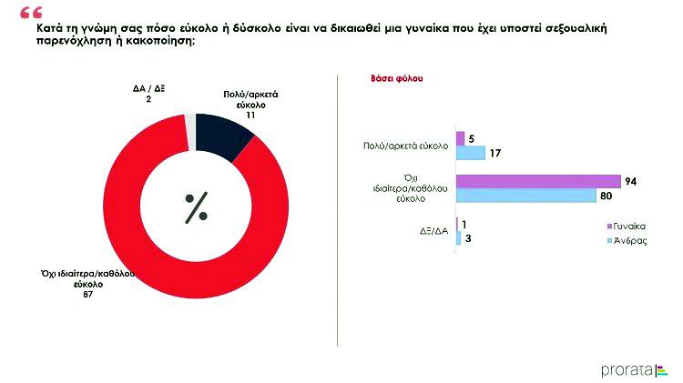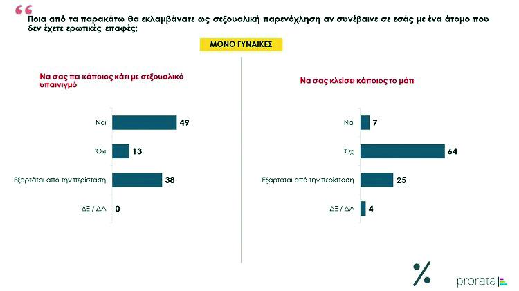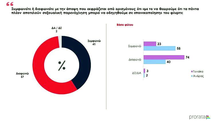 Ωστόσο, εξαιρετικά ανησυχητικό είναι το εύρημα που αποτυπώνει το εύρος της νομιμοποίησης της άποψης ότι «με το να θεωρούμε ότι τα πάντα πλέον αποτελούν σεξουαλική παρενόχληση μπορεί να οδηγηθούμε σε ‘‘ποινικοποίηση’’ του φλερτ». Πιο συγκεκριμένα, ενώ στον συνολικό πληθυσμό μόλις το 41% συμφωνεί με τη συγκεκριμένη άποψη και το 57% διαφωνεί, η συγκεκριμένη αντίληψη είναι σημαντικά πιο δημοφιλής μεταξύ των ανδρών, οι οποίοι σε αντίθεση με τις γυναίκες τείνουν να την συμμερίζονται.