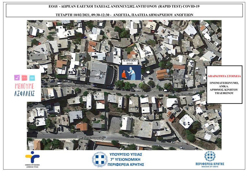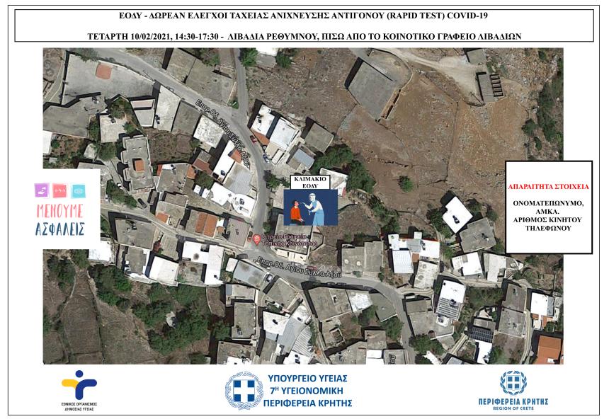 Έλεγχοι ταχείας ανίχνευσης αντιγόνου Covid-19 (rapid test) σε πεζούς θα πραγματοποιηθούν την Τετάρτη 10/02/2021 από κλιμάκια του ΕΟΔΥ στα Ανώγεια Ρεθύμνου και στα Λιβάδια Μυλοποτάμου, στο Ρέθυμνο.