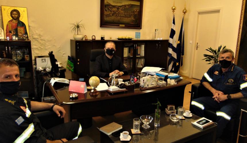 Τον νέο Διοικητή Πυροσβεστικής Υπηρεσίας Ν. Ρεθύμνου, Πύραρχο κ. Λάμπρο Κίτσιο, υποδέχθηκε χθες στο γραφείο του ο Δήμαρχος Ρεθύμνης κ. Γιώργης Χ. Μαρινάκης.