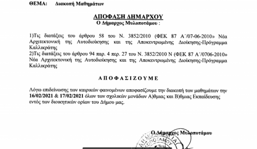 Με απόφαση του Δημάρχου Μυλοποτάμου κ. Δημήτρη Κόκκινου λόγω της επιδείνωσης των καιρικών φαινομένων και των δυσμενών προβλέψεων της Γ.Γ. Πολιτικής Προστασίας για τις επόμενες ημέρες, τα σχολεία Πρωτοβάθμιας και Δευτεροβάθμιας Εκπαίδευσης καθώς επίσης οι Βρεφονηπιακοί και Παιδικοί Σταθμοί του Δήμου Μυλοποτάμου θα παραμείνουν κλειστά την Τρίτη 16 Φεβρουαρίου 2021 καθώς επίσης την Τετάρτη 17 Φεβρουαρίου 2021. Για τη διενέργεια των μαθημάτων μέσω τηλεκπαίδευσης, οι σχετικές ενέργειες αφορούν τις δύο Διευθύνσεις Εκπαίδευσης αντίστοιχα.
