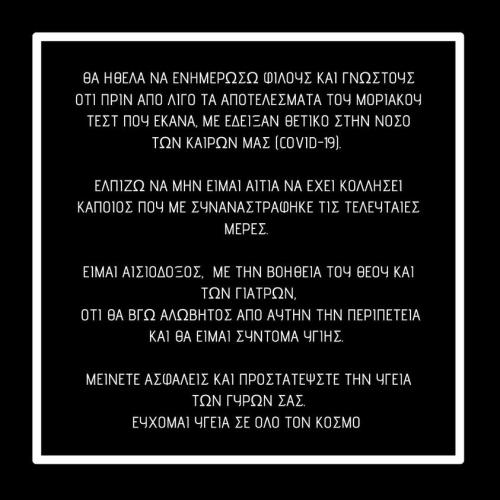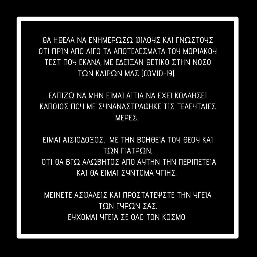 Στην ανάρτησή του αναφέρει: «θα ήθελα να ενημερώσω φίλους και γνωστούς ότι πριν από λίγο τα αποτελέσματα του μοριακού τεστ που έκανα, με έδειξαν θετικό στη νόσο των καιρών μας.