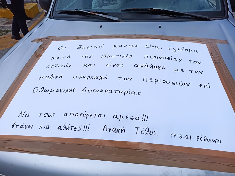 Πάνω από τρεις χιλιάδες πολίτες με περισσότερα από χίλια αυτοκίνητα απευθύνουν ηχηρό μήνυμα προς πάσα κατεύθυνση προκειμένου να αποσυρθούν και να ανασυνταχθούν οι δασικοί χάρτες της Π.Ε. Ρεθύμνου. Με μηχανοκίνητη στο κέντρο της πόλης του Ρεθύμνου οι πολίτες εκφράζουν την έντονη αντίδραση τους για το περιεχόμενο των δασικών χαρτών που αναρτήθηκαν για την Π.Ε. Ρεθύμνου πριν περίπου ένα μήνα. Αγροτικοί συνεταιρισμοί, σύλλογοι αγροτών και κτηνοτρόφων, πολίτες πολλών διαφορετικών επαγγελματικών κλάδων που ως ιδιοκτήτες περιουσίας, βλέπουν να χάνουν τη γη και τα ακίνητα τους, ζητούν την άμεση απόσυρση των δασικών χαρτών και τον επανασχεδιασμό τους στην βάση της πραγματική υφιστάμενης κατάστασης.